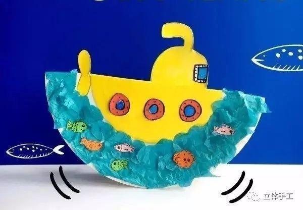将纸盘对折,凹处上面的部分,给孩子做个简单立体的小船吧!