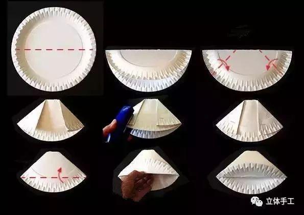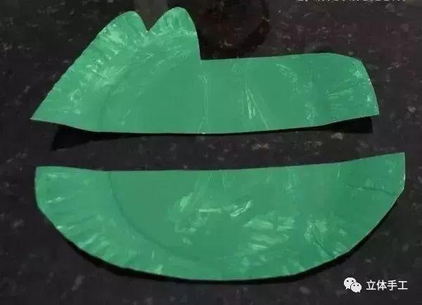 【制作步骤】纸盘对折,两角折向中间,把上层纸盘翻折出来,当做青蛙嘴巴部分。