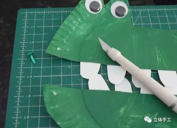 先用剪刀剪出鳄鱼头的形状,并剪些牙齿备用,用绿色的颜料将鳄鱼头涂满,再从中间剪开。