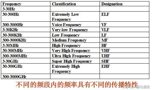 无线电波分布在3Hz到3000GHz之间,在这个频谱内划分为12个带。在不同的频段内的频率具有不同的传播特性:
