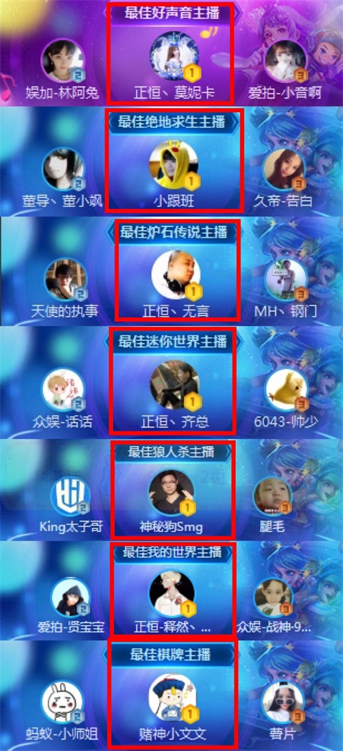 除此之外,正恒旗下的主播在各个游戏品类都有不俗战绩!下面看一下部分获得第一名的: