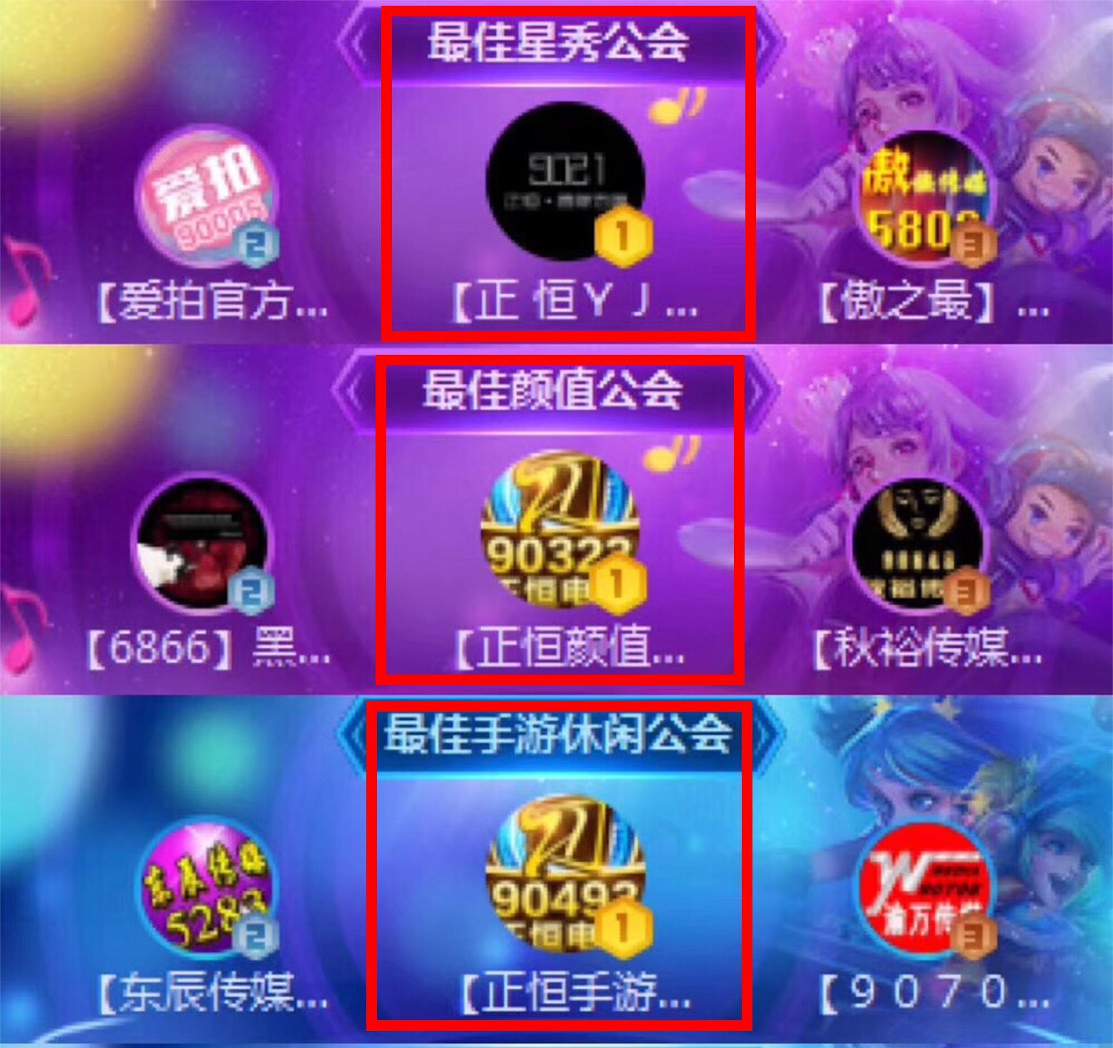 这个公会就是正恒,可以看到正恒获得了最佳星秀公会、最佳颜值公会、最佳手游休闲公会