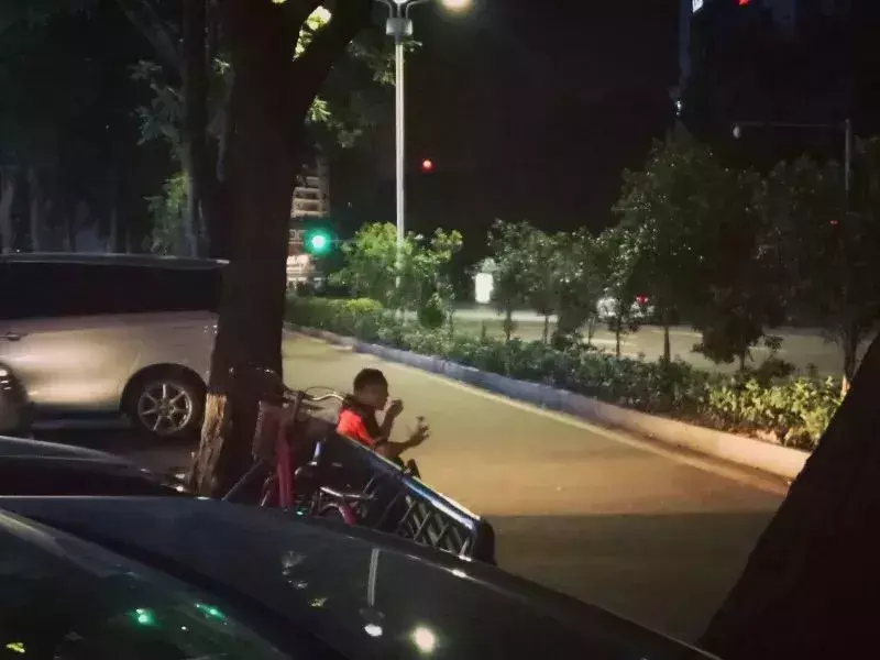 我们在肯德基门口看到了这位大叔,现在应该是送完餐后的休息时间,他就那样蹲在马路,啃着汉堡,平时热闹的街头,也归于平静。大叔看向远处,不知道他在想些什么?是想着送完这一餐后,就可以回家睡一觉就好了吗?