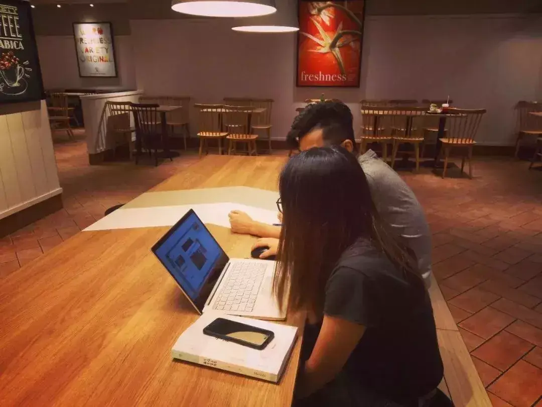这一群年轻人,围着一台电脑在讨论着什么。对于他们来说,夜晚才是脑洞大开的时候。