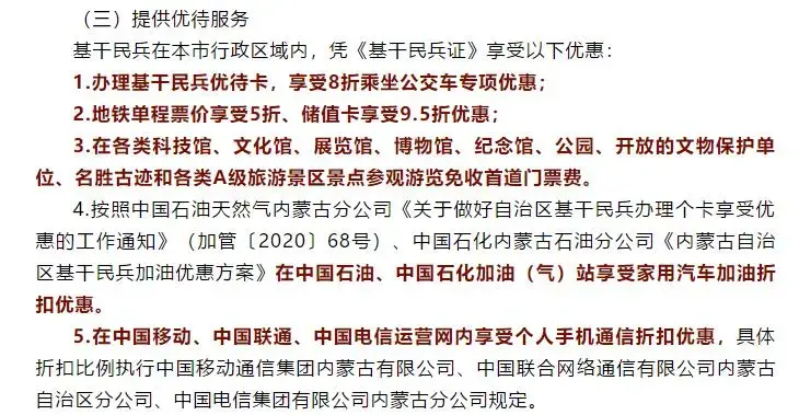3月11日,呼和浩特市印发《基干民兵优待和权益保障实施方案》,该市基干民兵将享有7项优先7项优待等福利。