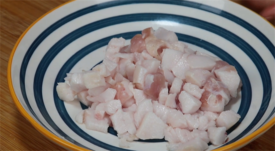 3、将清洗干净的作为前腿肉的外皮全部去掉,因为肉皮做酱是不好吃的,去完肉皮之后咱们再将肉切成丁,切好丁之后放到一个盘中备用。把咱们准备好的香菇取出来,将根茎去掉,然后再切成碎丁,尽量稍微碎一点,全部切完之后放入到一个盘中。