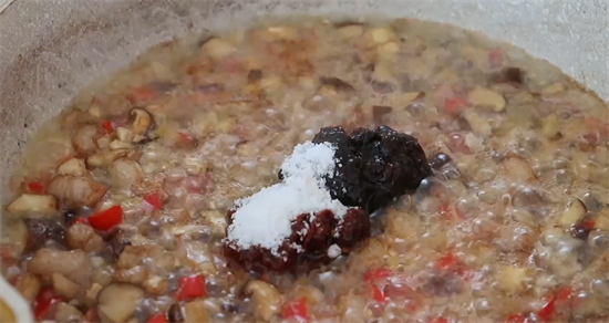 6、两分钟以后将香菇丁也放进去,用小火慢慢熬,把香菇丁里面的水分熬干,10分钟以后放入葱姜末,小米辣炒出香味,然后加入一勺豆瓣酱,一勺黄豆酱,适量的食盐,将它们翻炒均匀,小火继续熬煮,把水分熬干,慢慢地就能够闻到非常浓郁的香味,等到香菇酱变成色泽红润,表面飘着一层油的时候就可以出锅了。