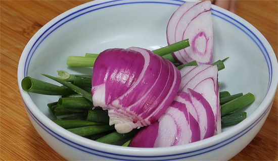 5、取出小葱清洗干净切段,切完段之后直接放到一旁备用,然后咱们再把准备好的洋葱洗净切片,全部切完之后放到一个盘中备用。在炒锅中加入适量的食用油,先将油烧热,然后将洋葱和小葱放进去先炸出香味,然后继续用小火慢慢炸,一直炸到洋葱和小葱变得焦黄之后,咱们将其控油捞出,然后将切好的肉丁放进去炒至变色。
