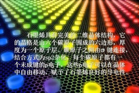 石墨烯是一种由碳原子以sp²杂化轨道组成六角型呈蜂巢晶格的二维碳纳米材料,是世上最薄却也是最坚硬的纳米材料,它几乎是完全透明的,只吸收2.3%的光。石墨烯具有优异的光学、电学、力学特性,在材料学、微纳加工、能源、生物医学和药物传递等方面具有重要的应用前景,被认为是一种未来革命性的材料。
