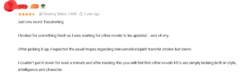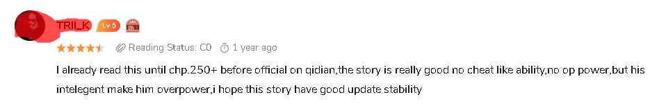 "我已经阅读了将近250章在起点官方上面,这个故事真的太棒了,并没有骗你们。没有强大逆天的力量,但是他的聪明弥补了一切。我期待这本书能够一直更新下去。"