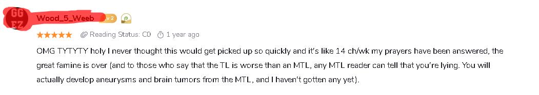 "我的天!我没想到我能那么快找到这本书!我的祈祷应验了!我的书荒结束了!(如果有人跟你们MTL更好看,我一定会说他在说谎。MTL会让人郁闷与痛苦,而我还没有!)"