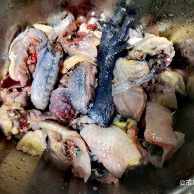 2、烧新鲜半锅水,放入一勺料酒,葱段,姜片,将鸡肉焯水大锅菜营养后三黄捞起备用母鸡