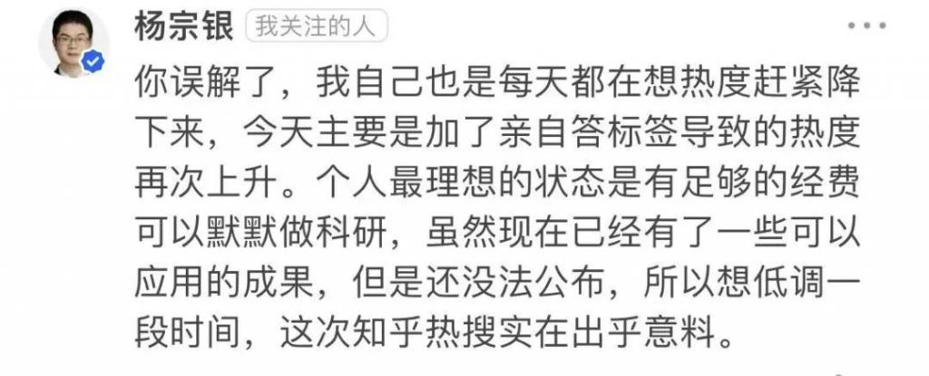 杨宗银认真回复:" 我每天都想热度降下来,只想默默做科研。"
