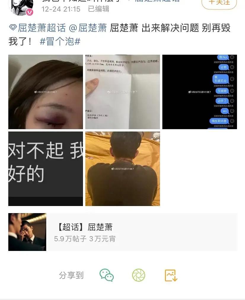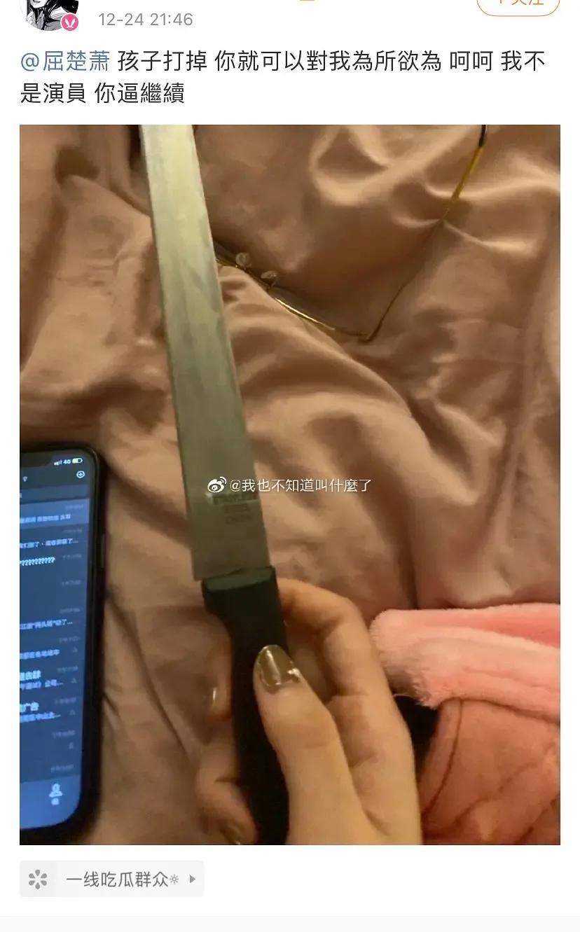 该女子爆料称自己遭屈楚萧殴打导致流产,还晒出自己的瘀伤照,以及割腕留下的伤痕照和刀子,引发网友热议。
