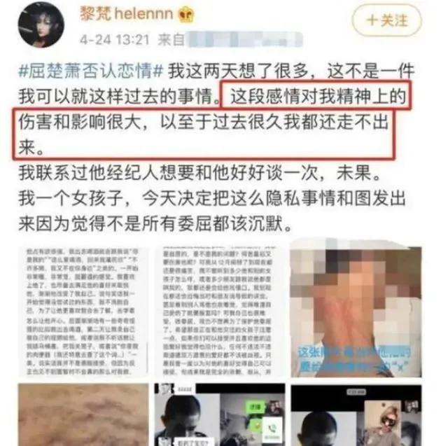 前女友黎梵曾发长文爆料屈楚萧在恋情中的种种怪癖以及带给她的伤害,有理有据,晒出了一大堆的恋情截图以及被伤害的过程,甚至存在暴力行为。