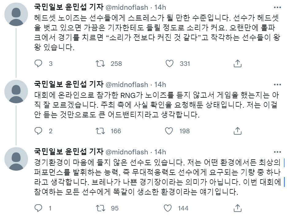 “头戴式耳机的噪音是会给选手带来压力的因素。选手把头戴式耳机摘下来,声音大到偶尔记者都能听见(里面的白噪音)。时隔很久在LOL PARK打比赛的选手偶尔都会有‘声音更大了的’的错觉,我现在还不清楚,以线上形式参加MSI的RNG是否是在不听白噪音的情况下打比赛的。我们已经请求主办方确认相关事实。我认为只是不听白噪音这一点就是巨大的优势了。“