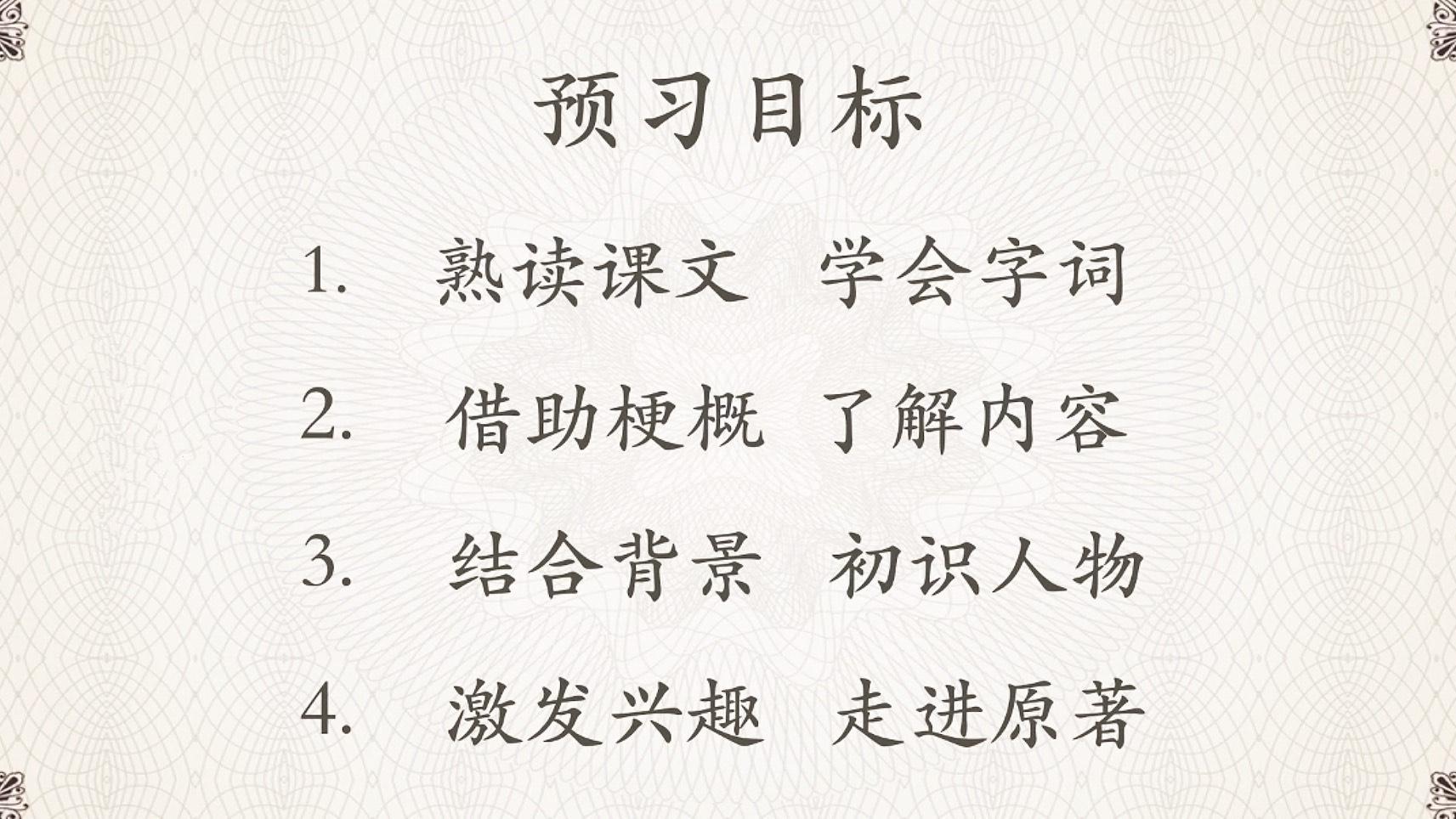 了解了什么是梗概,那么本课的预习目标有哪些呢?大家记住这四点: 熟读课文、学会字词;借助梗概、来了解主要内容;结合创作背景、初识人物;激发学生的阅读兴趣、走进名著。