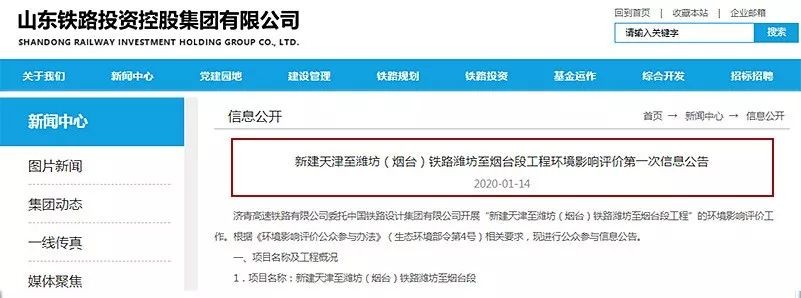 1月14日,《新建天津至潍坊(烟台)铁路潍坊至烟台段工程环境影响评价第一次信息公告》在山东铁投网站正式发布。