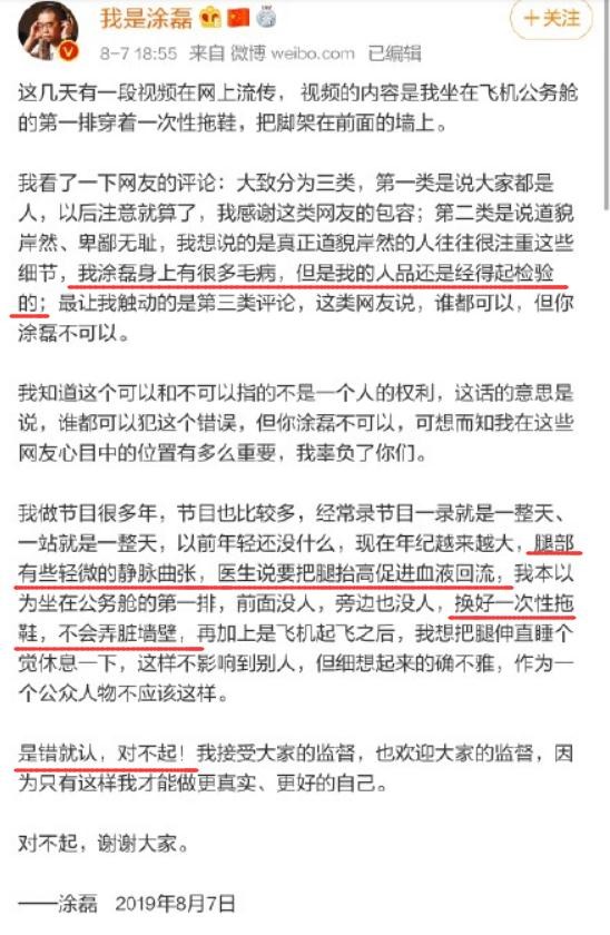 对于此事,涂磊也是于8月7日发长文进行了道歉,并对其行为进行了解释,涂磊表示因为腿部有静脉曲张,医生建议抬高腿促进血液回流,而且是专门换了一次性拖鞋之后。