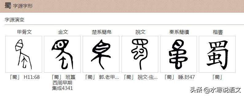 其实这里的“蜀”同时兼有表形的作用,因为“蜀”是象形字。从虫。上目象蜀头形,中象其身蜎蜎(蜎yuān形容虫子爬行的屈曲蠕动的样子)。本义:蛾蝶类的幼虫。