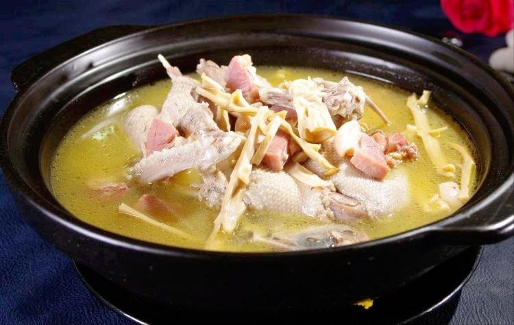 笋干老鸭煲的主要食材是土鸭、笋干、火腿,讲究点的必须选用隔年老鸭、天目山笋干和金华火腿。这道菜汤汁香醇,味道浓厚。