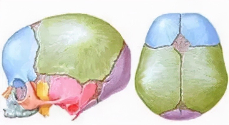 宝宝的头骨是由许多块骨骼构成,下图中,头型的改变主要是由紫色枕骨、绿色顶骨的发育不良引起的。