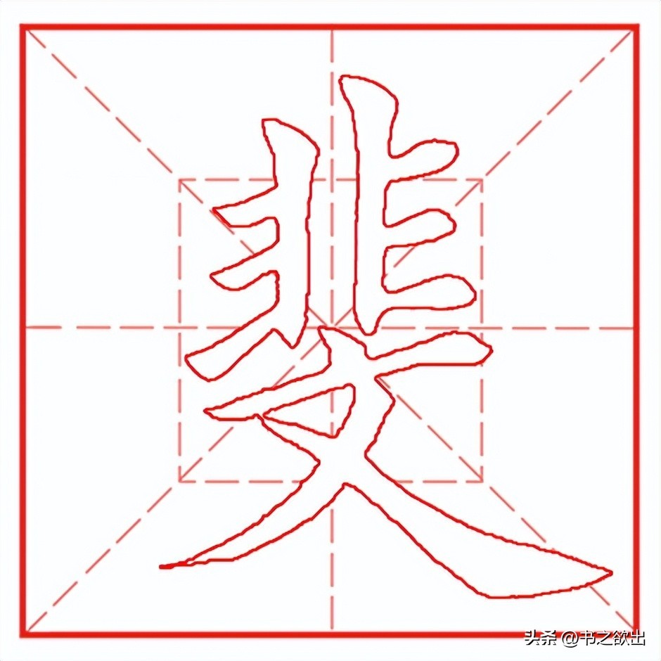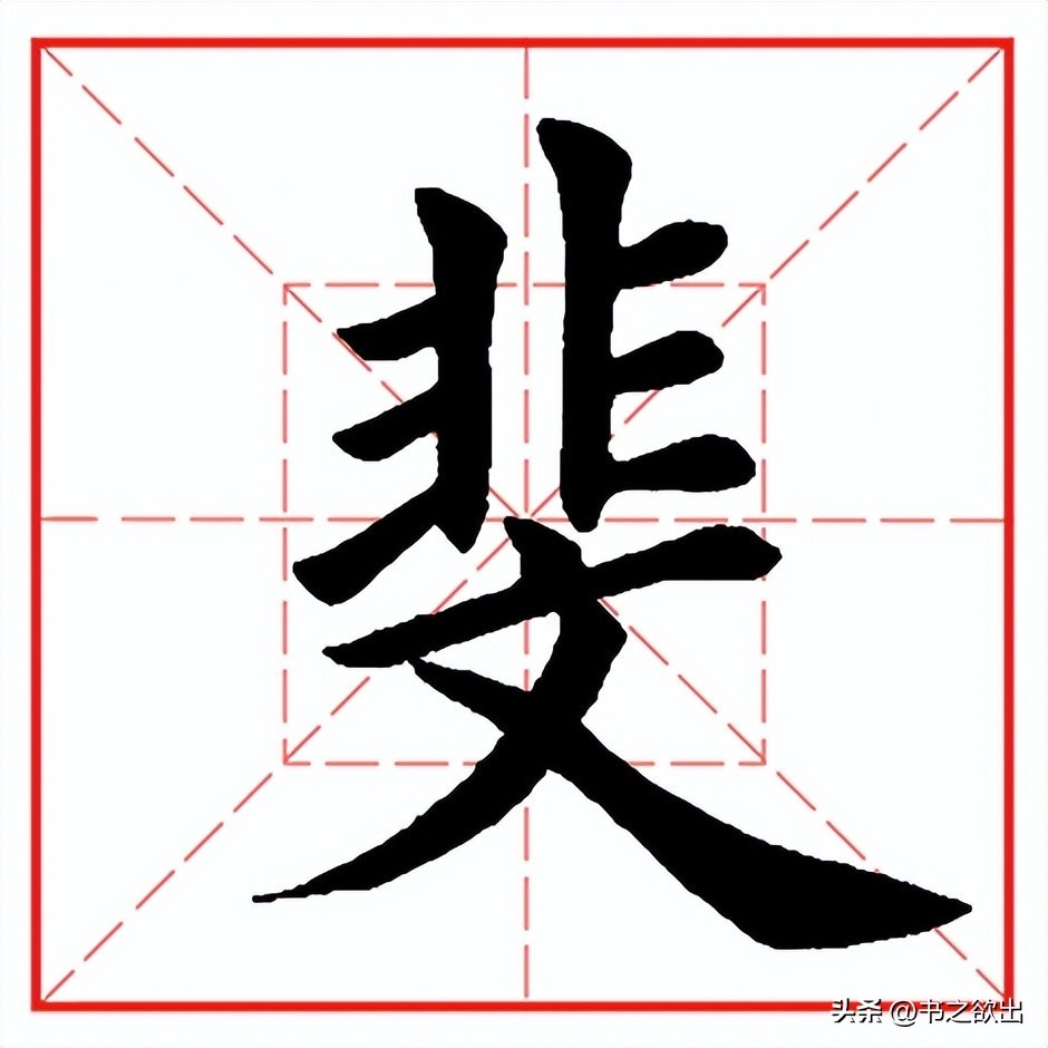 上部“非”字左低右高,左斜右正,诸横形态各异,切忌联排。左竖以斜切起笔,然后转中锋向下直行,不宜过长;左边两个横画抗肩,收笔藏于竖画;第三横写作提笔,起笔左探,抗肩角度稍大;右竖起笔略高,中锋下行,垂直有力,收笔垂露;右边三个横画起笔与左边三横的收笔对应,整体略取平势,并且间距相等。