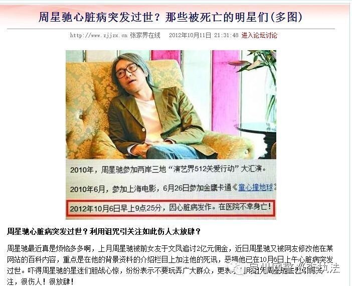 这么大的事情,不可能没有新闻出来吧,于是小编赶紧搜了一下,结果发现没有任何正式的官方新闻说他去世,倒是在2012年开始就有人在网上造谣周星驰去世.....