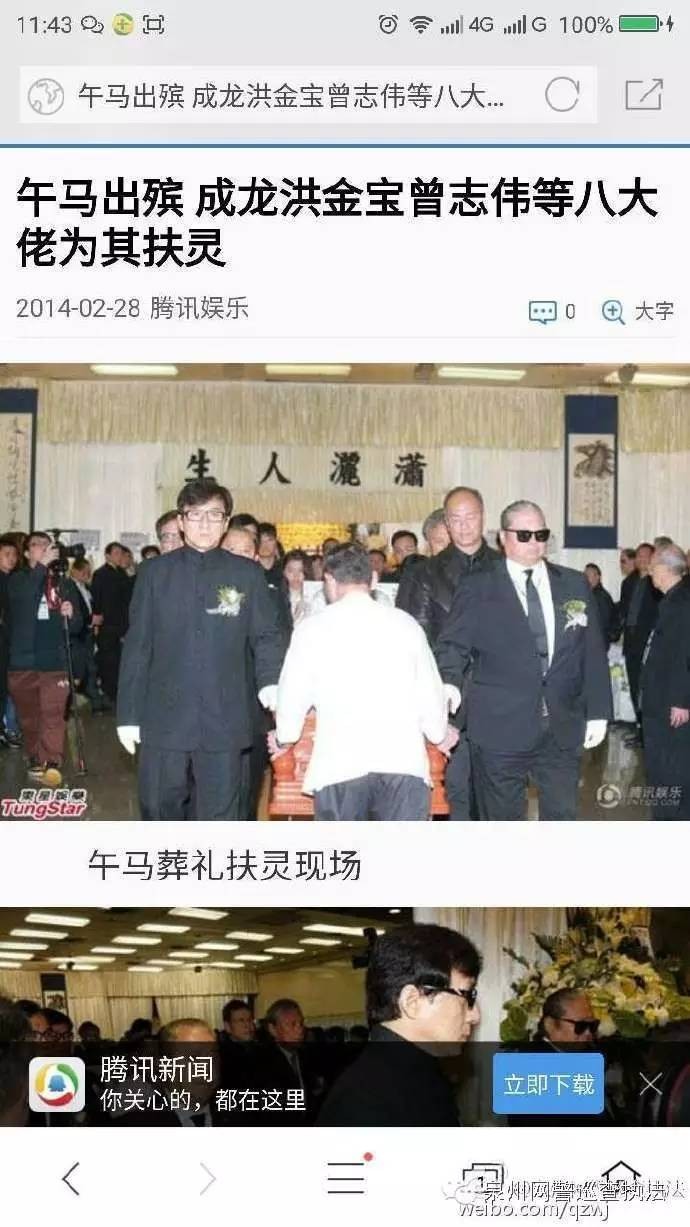 经核实,这次网上传播的图片是2014年香港明星午马出殡时,成龙等影星扶灵的照片。见下图: