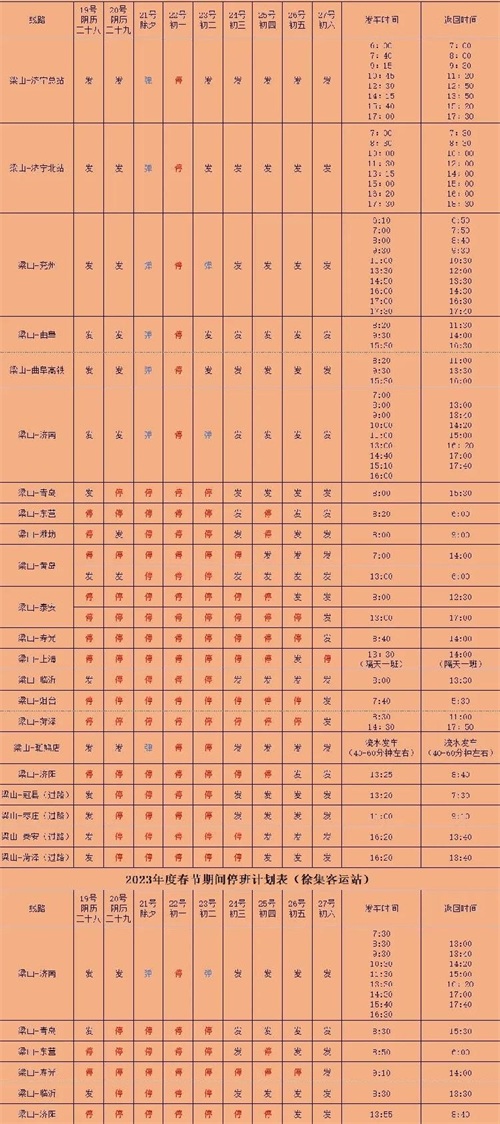 春运期间梁山汽车站客运班线运营计划详细如下。
