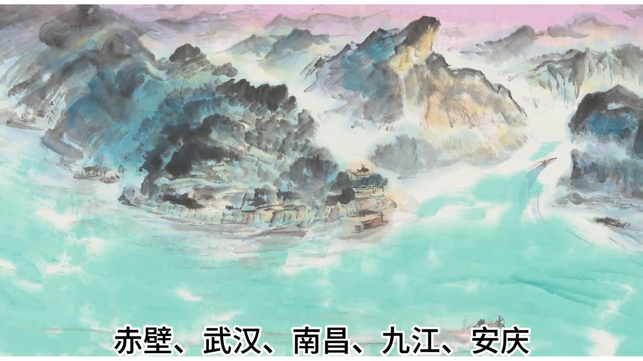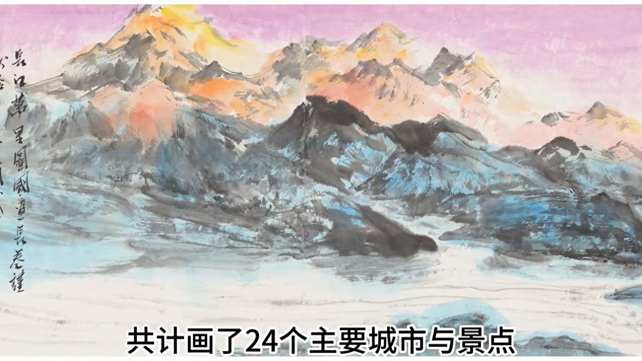 2. 长卷中从最西端的唐古拉山脉到最东端东海,画了 24 个主要城市与景点,包括唐古拉山、沱沱河、长江第一湾、玉龙雪山、虎跳峡、宜宾、重庆、石宝寨、白帝城、三峡、宜昌、荆州、岳阳、赤壁、武汉、南昌、九江、安庆、马鞍山、南京、太湖、南通、上海、东海等。
