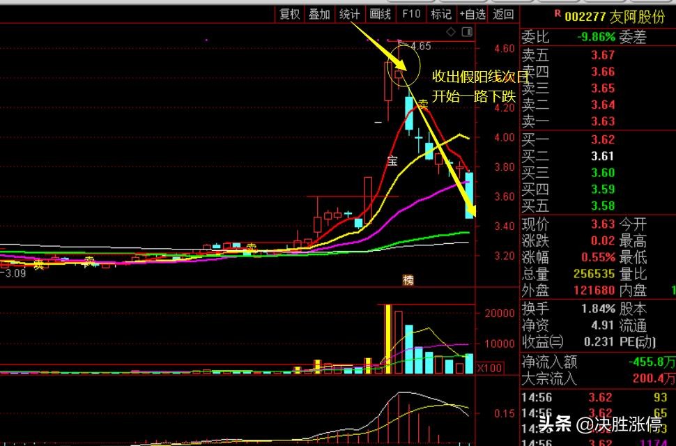 友情提醒:假阳线虽然在上涨过程中看跌,但它只是一根K线,而K线只决定短期走势。所以最终要判断往哪里走还要结合均线、形态、成交量等等来分析!