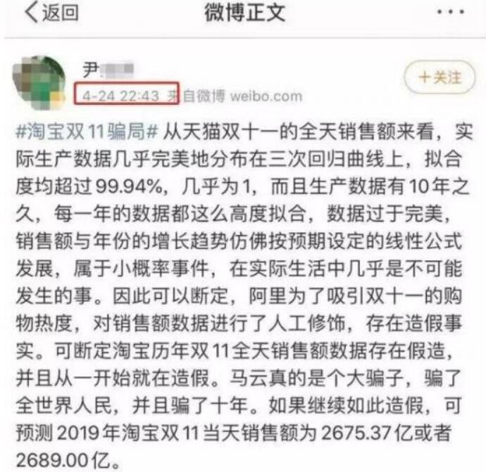 在这之前一篇发布于今年4月份、名为《淘宝 2009 至 2018 年历年双 11 销售额数据造假》的文章刷爆互联网,文章质疑天猫双十一有数据造假可能,对于这一言论,天猫官方也正面回应,,已就这则谣言启动司法流程,希望再没有这样侮辱大家智商的“智商测试”。天猫表示该文作者在 2015 年的时候也发布了一篇有关亚马逊数据预测的文章,除了将“贝索斯”替换为“马云”之外,其他大部分内容几乎没有变动,重复率高达90%。